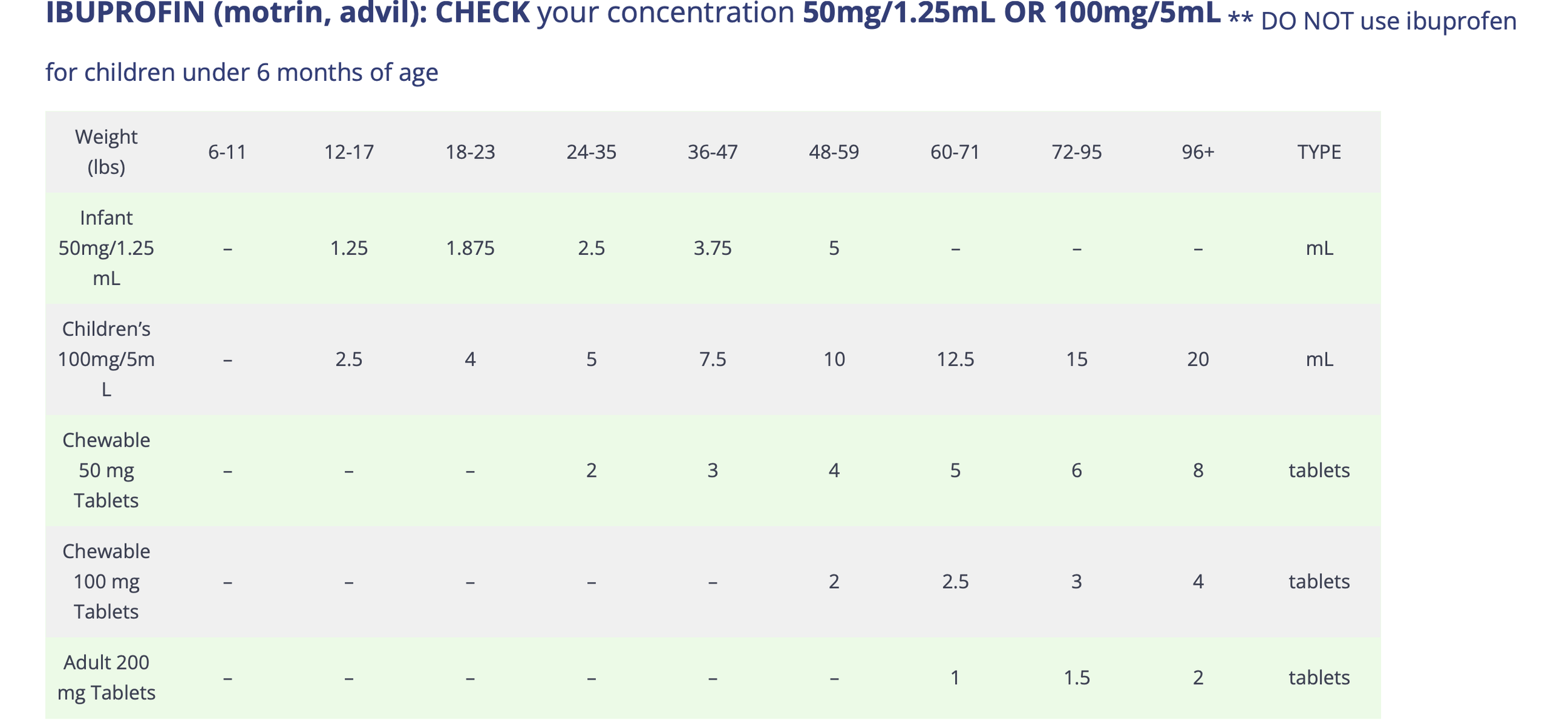 Please note: A fever in an infant under 2 months of age is an emergency, please call our office. If your child is under 6 months old, they cannot have Motrin/Ibuprofen.